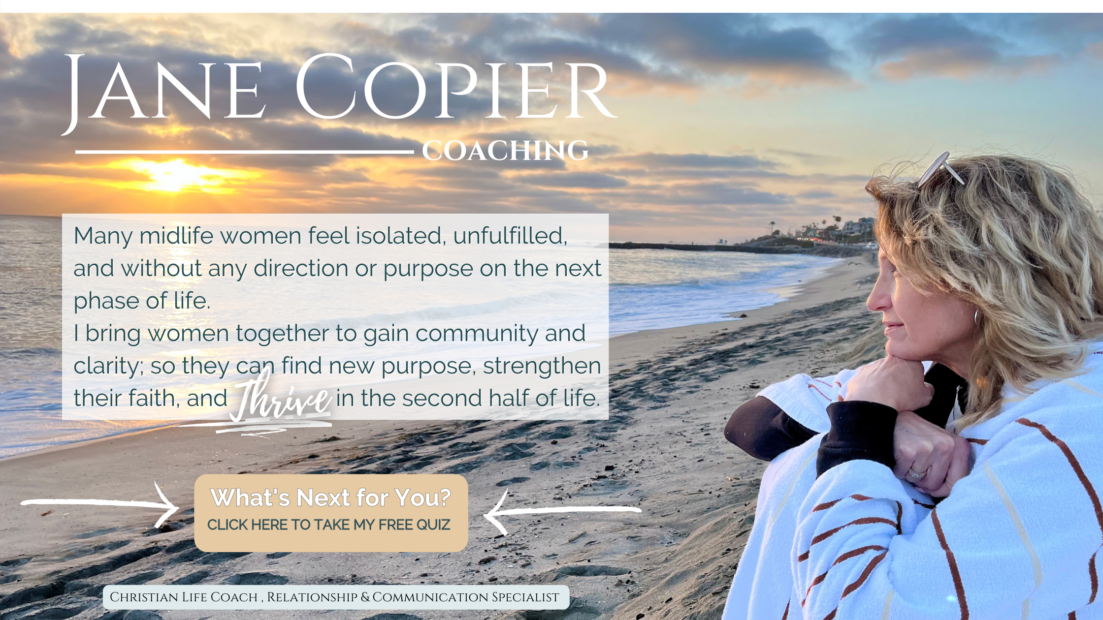 "Jane Copier is THE BEST life coach! She is warm, and real, and intelligent, and understands the mind in conjunction with the heart better than almost anyone I have ever met! I have referred her to many people who have come back to me, thanked me and said what a difference she has made. I have referred individuals, as well as married couples and they all have felt the same! You cannot go wrong with Jane"
